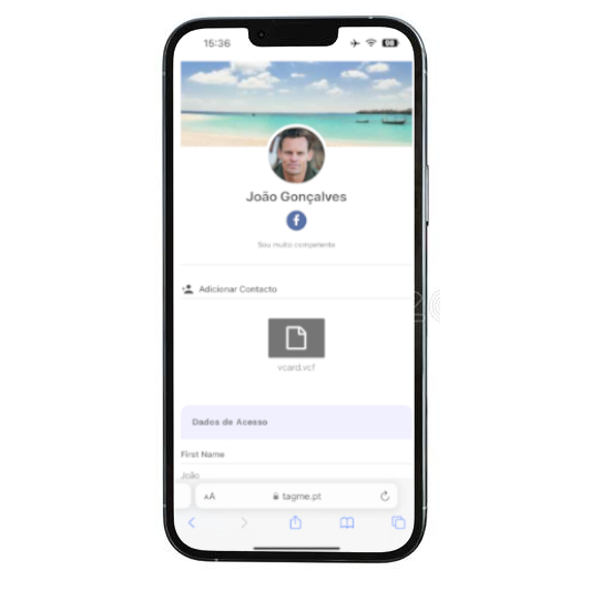 Assim que aproximar o cartão ao smartphone do seu cliente, irá ser redirecionado para a página do seu perfil com todas as informações que nele disponibilizar e com a opção de adicionar diretamente o contacto ao seu smartphone, sem ter que inserir os dados manualmente.