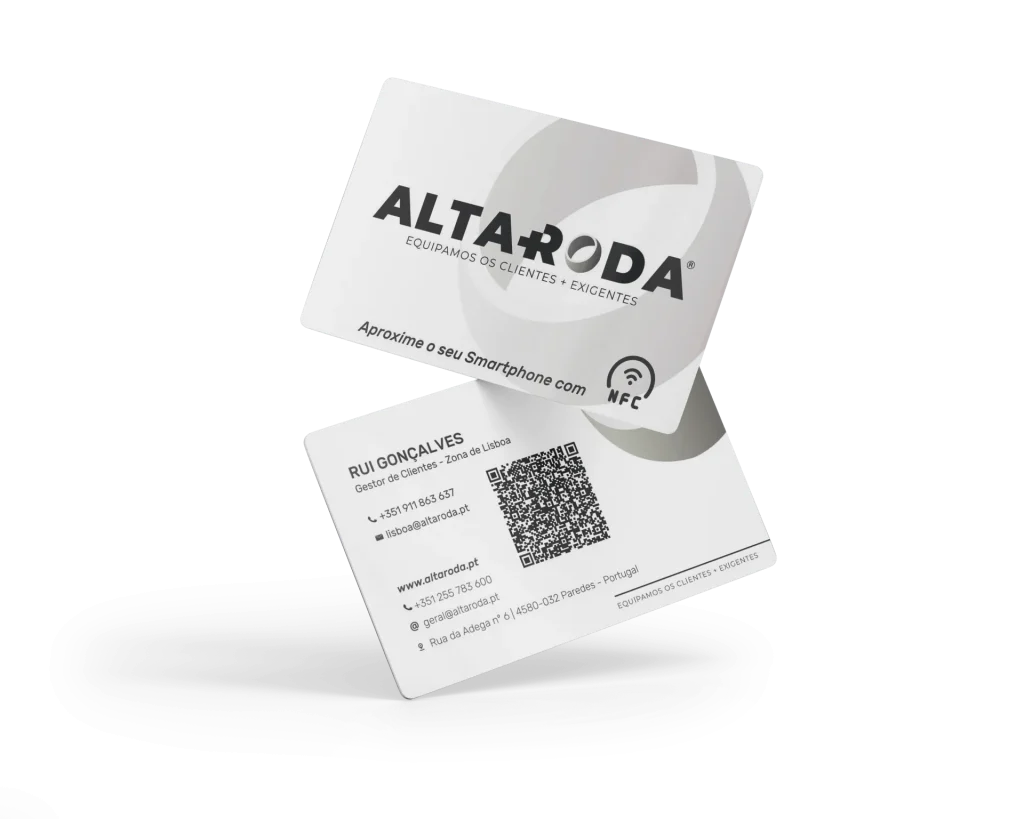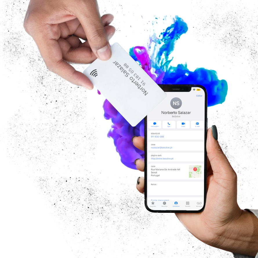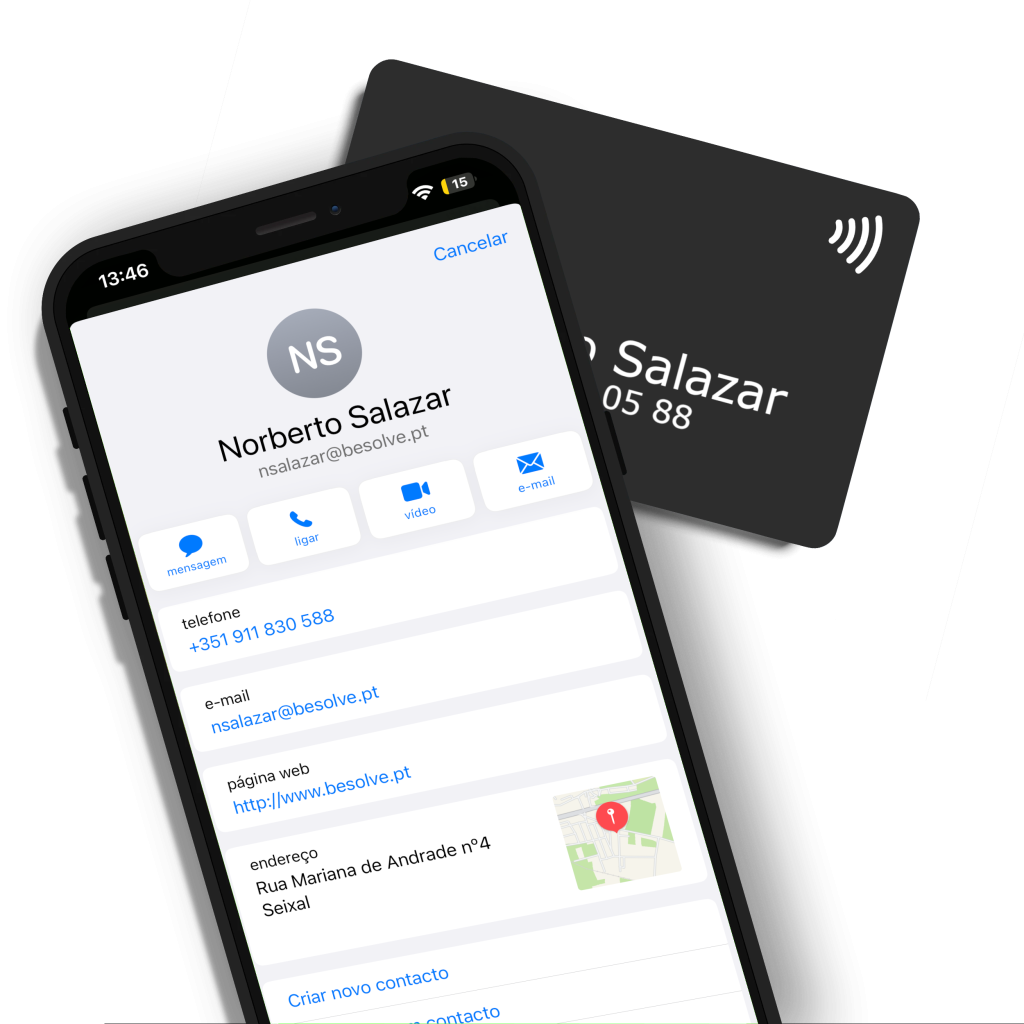 Aproxima o cartão fisico ao smartphone dos seus potenciais clientes ou mostra o seu QRCode para leitura através da camara do smartphone do seu cliente.
